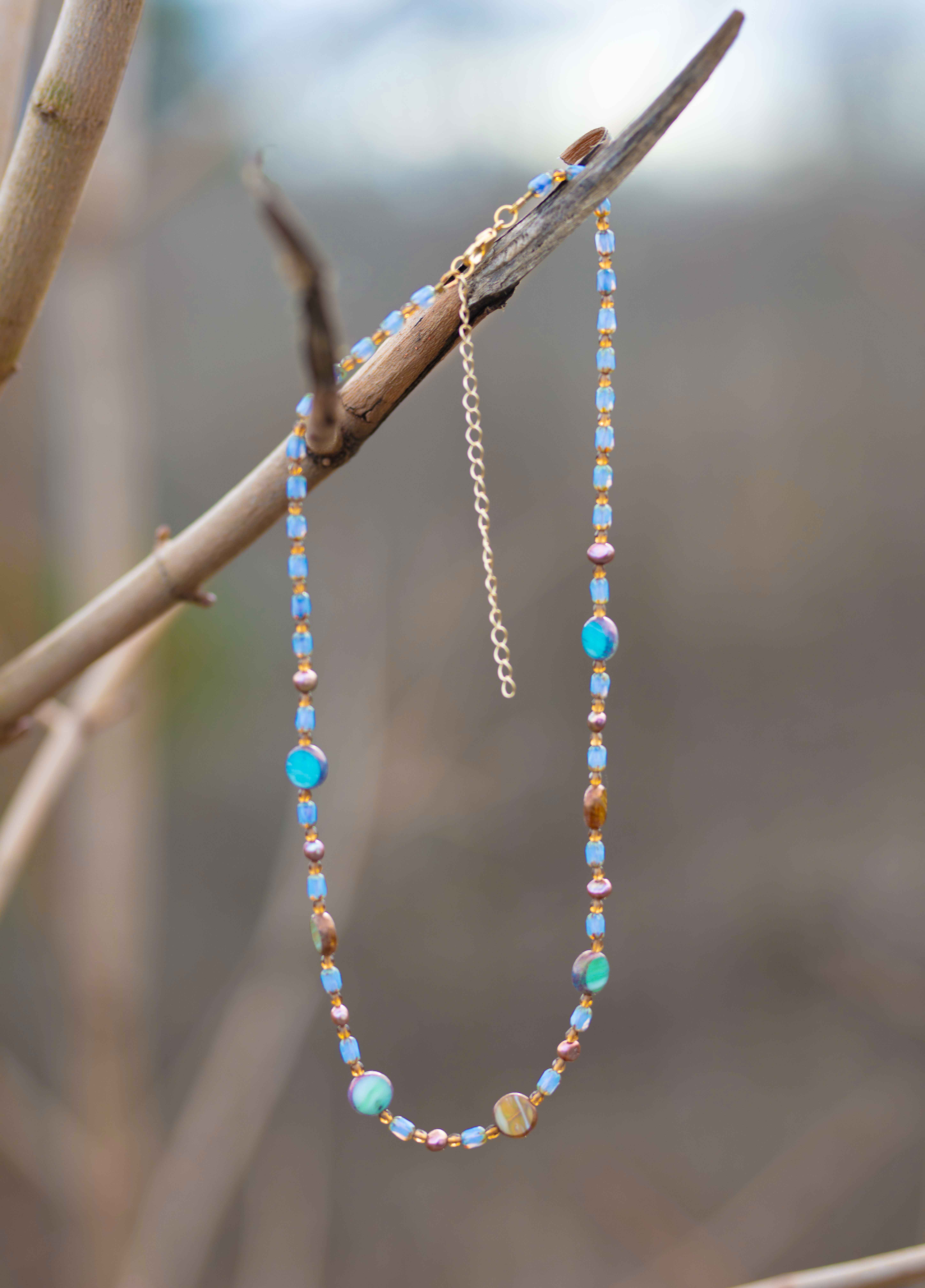 Et kjede for de lyse dagene, med perler i lette toner av turkis, gull og lyseblått.