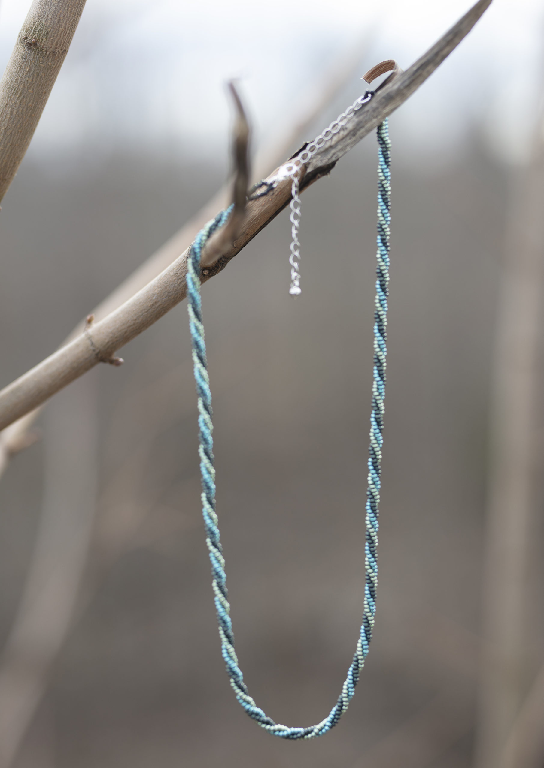 Et kjede i beroligende blå, himmelske nyanser – fra myk lavblå til sølvglimt.