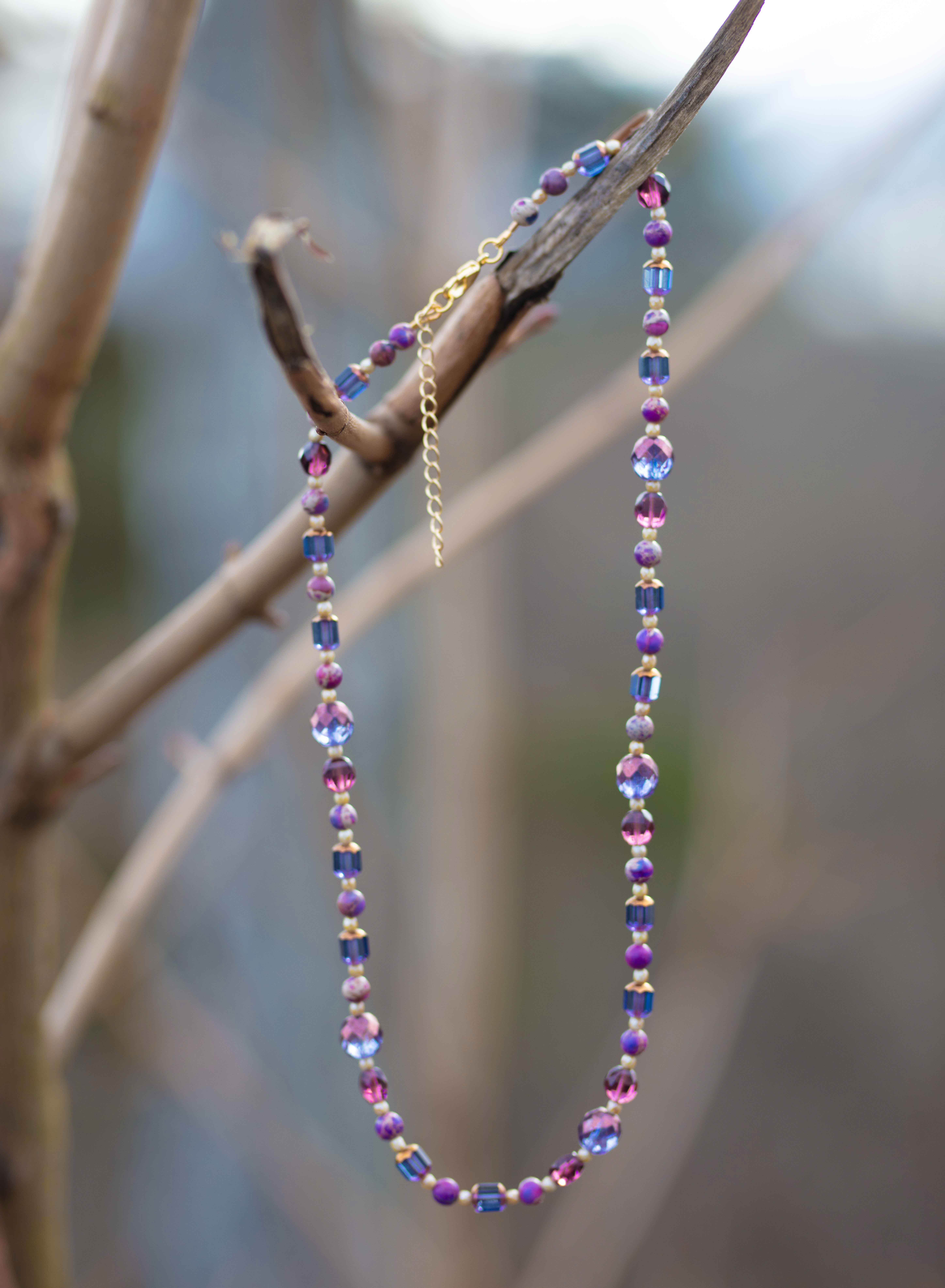 Et håndlaget halskjede som bærer en intens, men stille energi. Hver perle er valgt for sin egen varme og glød – nyanser av rosa, mystisk perlemor og dyp lilla danner et harmonisk uttrykk.
